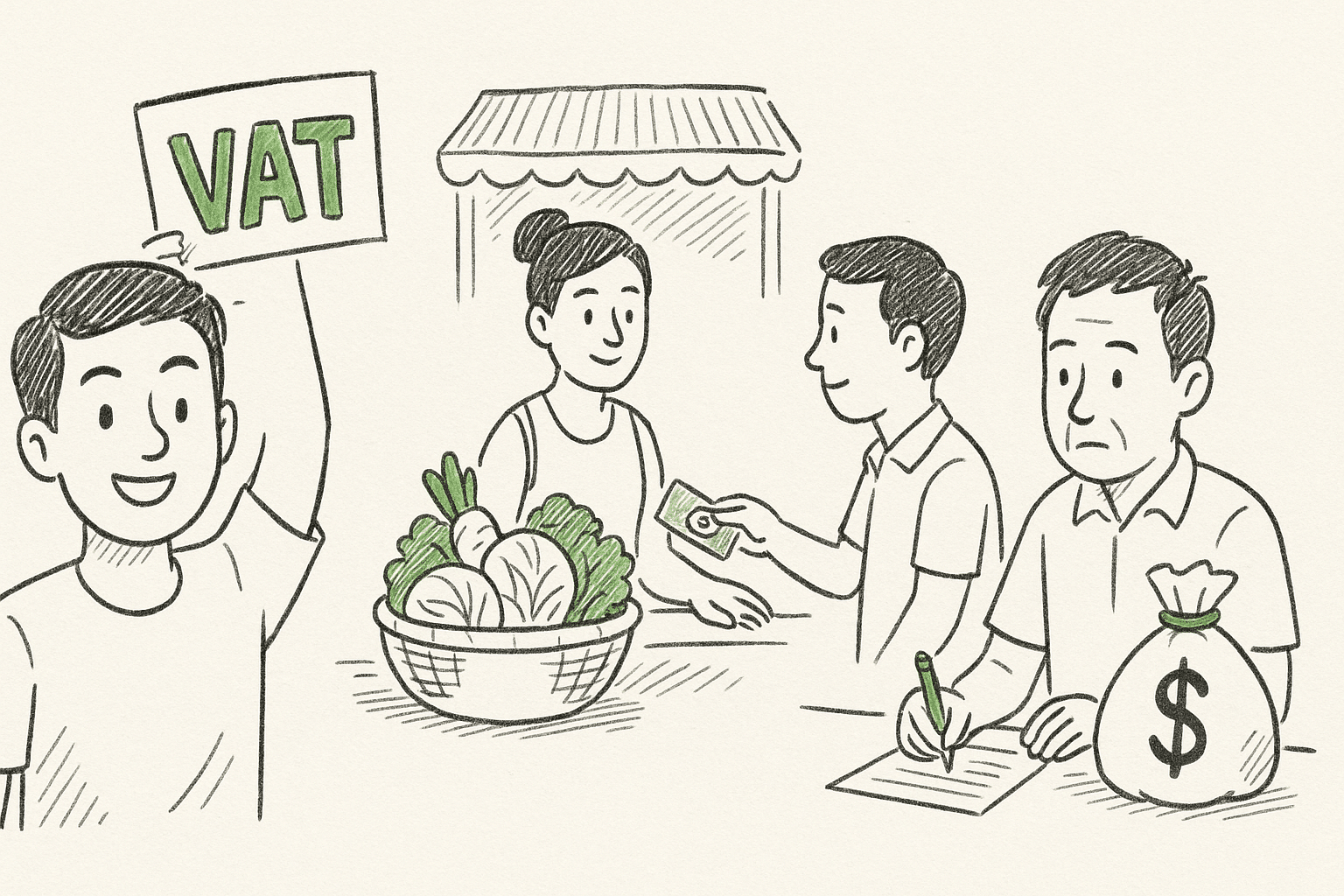 ภาษีมูลค่าเพิ่ม (VAT) เป็นภาษีที่เกิดจากการเพิ่มมูลค่าในแต่ละขั้นตอนของกระบวนการผลิตและการขายสินค้า โดยคิดจากมูลค่าที่เพิ่มขึ้นในขั้นตอนนั้น ๆ ตัวอย่างเช่น การขายสินค้าจากผู้ผลิตไปยังผู้ค้าส่ง และจากผู้ค้าส่งไปยังผู้บริโภค สินค้าแต่ละชิ้นจะถูกเก็บภาษีที่อัตรา 7% ของมูลค่าขาย